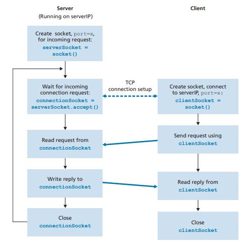 - TCP 서버 애플리케이션은 '환영 소켓'을 갖고 있다. 이 소켓은 포트 번호 12000을 가진 TCP 클라이언트로부터 연결 설정 요청을 기다린다.