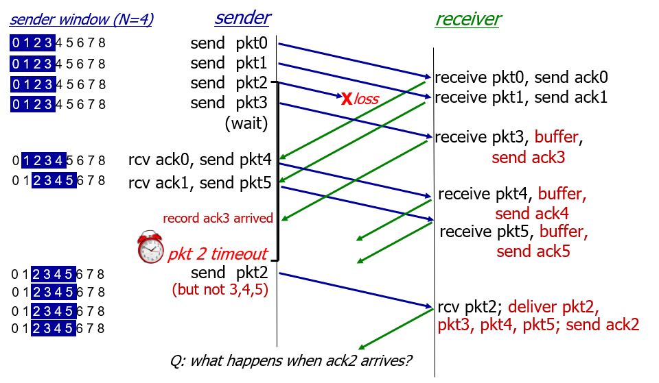 수신버퍼는 0번,1번 패킷을 받으면 수신 윈도우 시작점을 2로 옮긴다. 패킷 2번이 손실되었지만 3번, 4번, 5번 패킷을 받았으므로 수신 윈도우는 2 3 4 5에 위치할 것이다. 만약 2번 패킷을 받았다면 수신 윈도우는 6 7 8 9로 옮겨질 것이다.