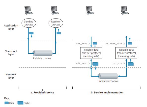 이러한 서비스 추상화를 구현하는 것이 신뢰적인 데이터 전송 프로토콜(reliable data transfer protocol)의 의무다. 이 작업은 신뢰적인 전송 프로토콜의 '아래에 있는' 계층이 신뢰적이지 않을 수 있어서 어려워진다.