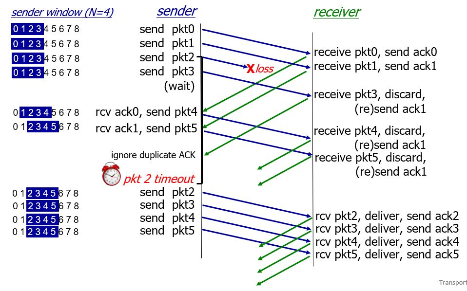 - ACK(n)을 받으면 윈도우는 n+1으로 이동한다.