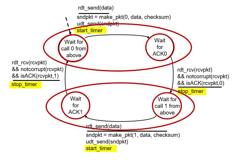 - 시간 기반의 재전송 메커니즘을 구현하기 위해, 주어진 시간이 지난 후에 송신자를 인터럽트(중단)할 수 있는 카운트다운 타이머(countedown timer)가 필요하다.