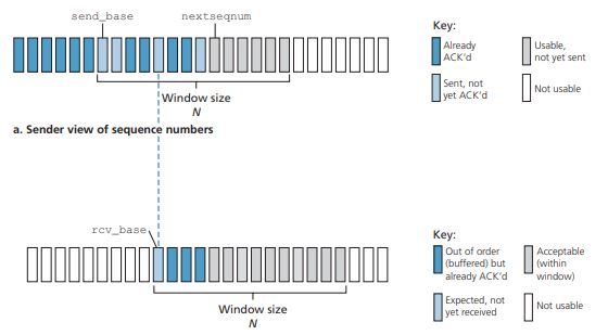프로토콜이 동작할때, N인 윈도는 오른쪽으로 이동한다. N을 윈도 크기(window size)라고 부르며, GBN 프로토콜을 슬라이딩 윈도 프로토콜(sliding-window protocol)이라고 부른다.