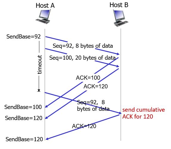 호스트 A는 첫 번째 타임 아웃에서 아무런 응답을 받지 못해서 새로운 타이머때 Seq=92인 세그먼트를 재전송한다. 새로운 타임아웃 이전에 두 번째 세그먼트에 대한 ACK가 도착하므로, 두 번째 세그먼트는 재전송되지 않는다.