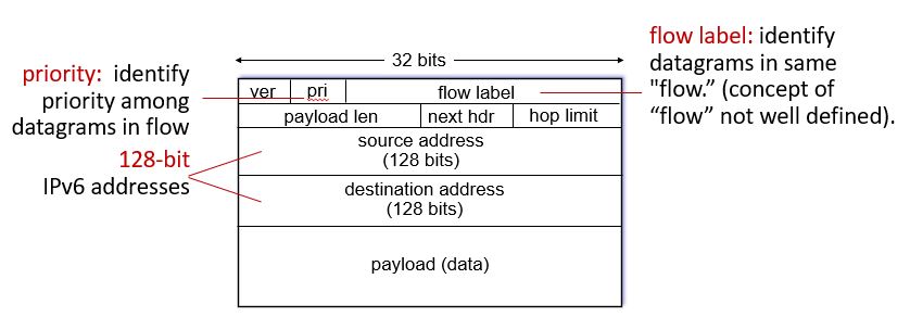 - 트래픽 클래스(그림에서 pri) : 8비트 필드, 흐름 내의 데이터그램에 우선순위를 부여하는데 사용한다.