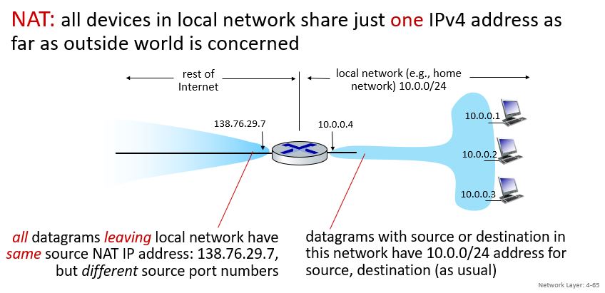 NAT라우터는 홈 네트워크가 아닌외부 세계에서 하나의 IP 주소를 갖는 하나의 장비로 동작한다.