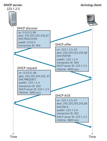 - DHCP 서버 발견 : 새롭게 도착한 호스트는 상호작용할 DHCP를 발견한다. 호스트는 DHCP 발견 메시지(DHCP discover message)를 사용하여 수행되며, 클라이언트는 포트 67번으로 UDP 패킷을 보낸다. 호스트는 DHCP 서버 주소를 모르기 때문에 브로드캐스트 255.255.255.255를 목적지 IP 주소로 설정하고, 출발지 IP 주소를 0.0.0.0으로 설정한다.