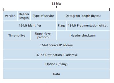 - TTL(time-to-live) : 네트워크에서 데이터그램이 무한히 순환되지 않도록 한다. 이 필드값은 라우터가 데이터그램을 처리할 때마다 감소한다. TTL 필드가 0이 되면 라우터가 데이터그램을 폐기한다.
