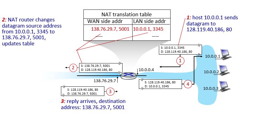WAN에서 같은 목적지 IP 주소를 갖는 NAT 라우터에 모든 데이터그램이 도착하면, 라우터는 NAT 변환 테이블(NAT translation table)을 이용해서 내부 호스트를 식별할 수 있다. NAT 변환 테이블은 IP 주소와 포트번호를 포함하고 있다.