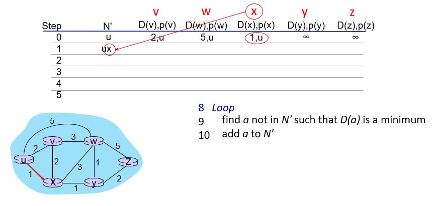 - 반복은 N'에 모든 노드가 포함될 때 까지 계속해서 반복한다.