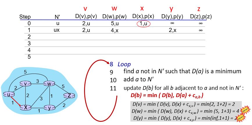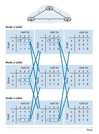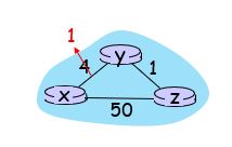 Dx(y) = min{c(x,y) + Dy(y), c(x,z) + Dz(y)} = min{2 + 0, 7 + 1} = 2