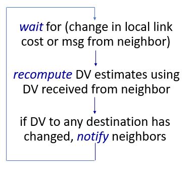 - 특정 노드가 자신에게 직접 연결된 링크 중 하나의 비용이 변경된 사실을 알게 되거나, 어떤 이웃으로부터 변경된 거리벡터를 수신했을 때 자신의 거리 벡터 추정값을 갱신한다.