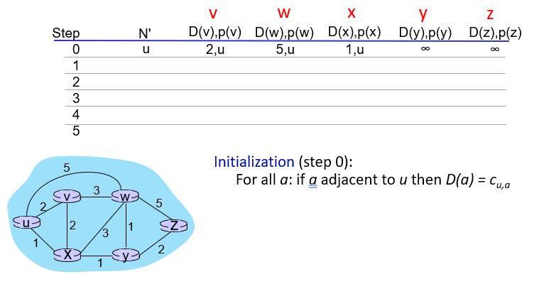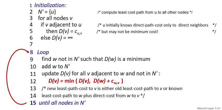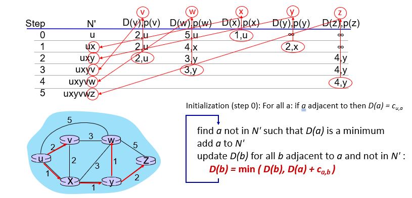 - 네트워크 전체에 대한 완전한 정보를 가지고 출발지와 목적지 사이의 최소 비용 경로를 계산한다.