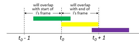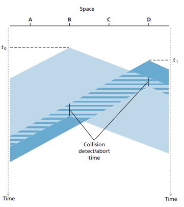 시각 t0에는 B는 다른 노드가 아무 전송도 하지 않으므로 프레임을 전송한다. t1 시점에 D는 B에 의해 전송되는 프레임을 감지하지 못했으므로 자신의 프레임을 전송한다. 약간의 시간이 경과한 후 D에서 B가 전송한 것과 D의 전송이 간섭을 일으킨다.
