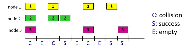 - 충돌이 발생했다면 노드는 프레임이 충돌 없이 전송될 때까지 확률 p로 해당 프레임을 다음 슬롯들에서 재전송한다.