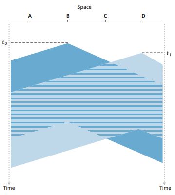 시각 t0에는 B는 다른 노드가 아무 전송도 하지 않으므로 프레임을 전송한다. t1 시점에 D는 B에 의해 전송되는 프레임을 감지하지 못했으므로 자신의 프레임을 전송한다. 약간의 시간이 경과한 후 D에서 B가 전송한 것과 D의 전송이 간섭을 일으킨다.