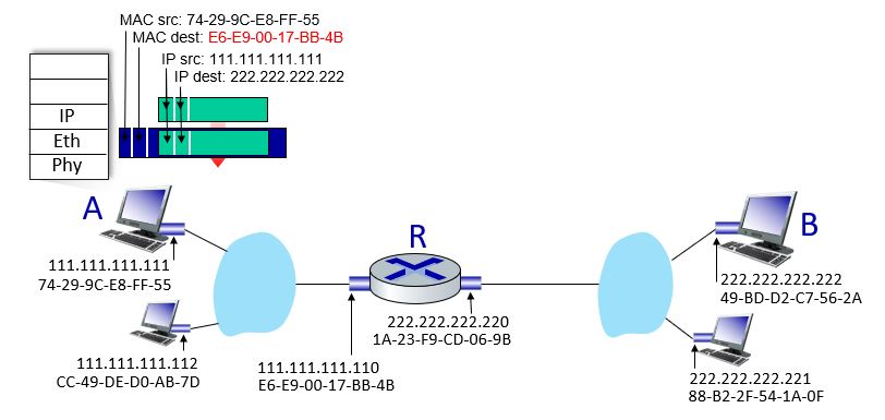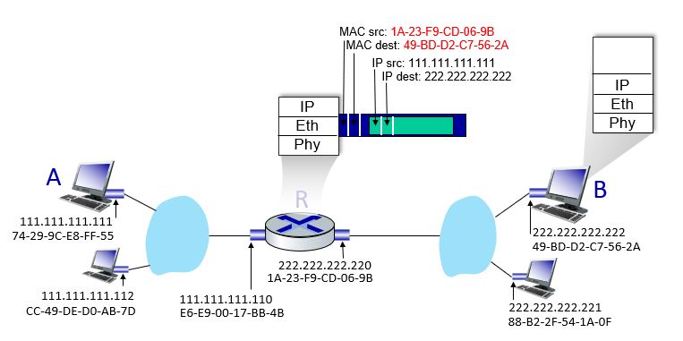 - A에서 B로 향하는 IP 데이터그램, B의 MAC 주소를 목적지로 하는 프레임을 포함한다.