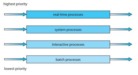 각 큐는 낮은 우선수위의 큐보다 절대적인 우선순위를 가진다. 각 큐는 상위 우선순위의 큐가 비어있지 않으면 실행될 수 없다.