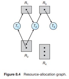 T2는 R3을 기다리고 있고, T3는 T1 또는 T2가 R2를 해제하기를 기다리고 있다. 그리고 T1은 T2가 R1을 해제하기를 기다리고 있다.