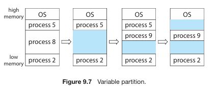 - 5번, 8번, 2번 프로세스가 할당되었다가, 8번 프로세스가 종료되면 하나의 hole이 생긴다. 이후 9번 프로세스가 도착하고 메모리가 할당된다. 5번 프로세스가 종료되면 두 개의 hole이 생긴다.