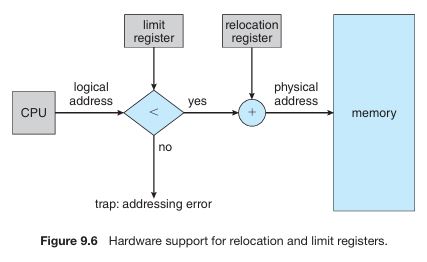 CPU 스케줄러가 다음에 수행할 프로세스를 선택할 때, 디스패처는 문맥 교환의 일환으로 재배치 레지스터와 상한 레지스터에 정확한 값을 적재한다.