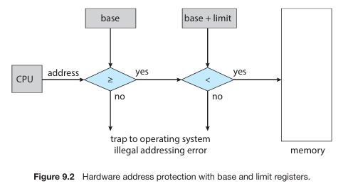 - CPU가 생성하는 모든 주소는 이 레지스터들을 통해 확인되기 때문에, 현재 실행 중인 프로세스가 운영 체제와 다른 사용자들의 프로그램 및 데이터를 수정하지 못하도록 보호할 수 있다.