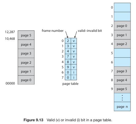 페이지 테이블의 각 엔트리에는 유효/무효(valid/invalid)라는 비트도 존재한다. 이 비트가 유효로 설정되면 그 페이지는 프로세스의 합법적인 페이지를 나타내며, 무효로 설정되면 그 페이지는 프로세스의 논리 주소 공간에 속하지 않는다는 것을 나타낸다.