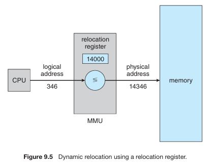 재배치 레지스터는 가장 작은 물리 주소의 값을 저장하고, 상한 레지스터는 논리 주소의 범위 값을 저장한다. 각각의 논리 주소는 상한 레지스터가 지정한 범위 안에 존재해야 한다. MMU는 동적으로 논리 주소에 재배치 레지스터의 값을 더함으로써 주소를 변환하는 역할을 한다.
