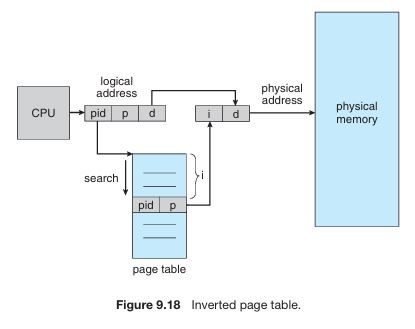 - 역 페이지 테이블에서 일치하는 것이 있는지 검사하고, 일치하는 것이 i번째 엔트리에서 발견되면 물리주소는 <i, offset>이 되고, 일치하는 것이 없으면 잘못된 메모리 접근으로 간주한다.