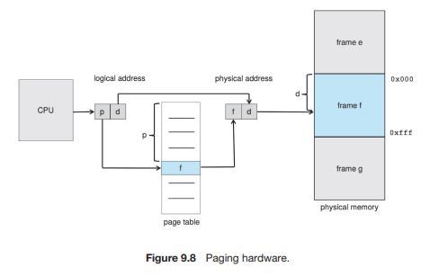 CPU로 부터 생성된 모든 주소는 페이지 번호(p)와 페이지 오프셋(d: offset)두 개의 부분으로 나누어진다.