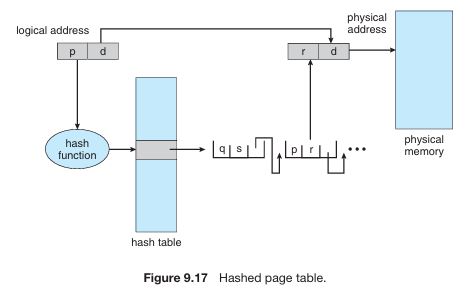 주소 공간이 32비트보다 커지면 가상 주소를 해시로 사용하는 해시 페이지 테이블을 많이 사용한다.